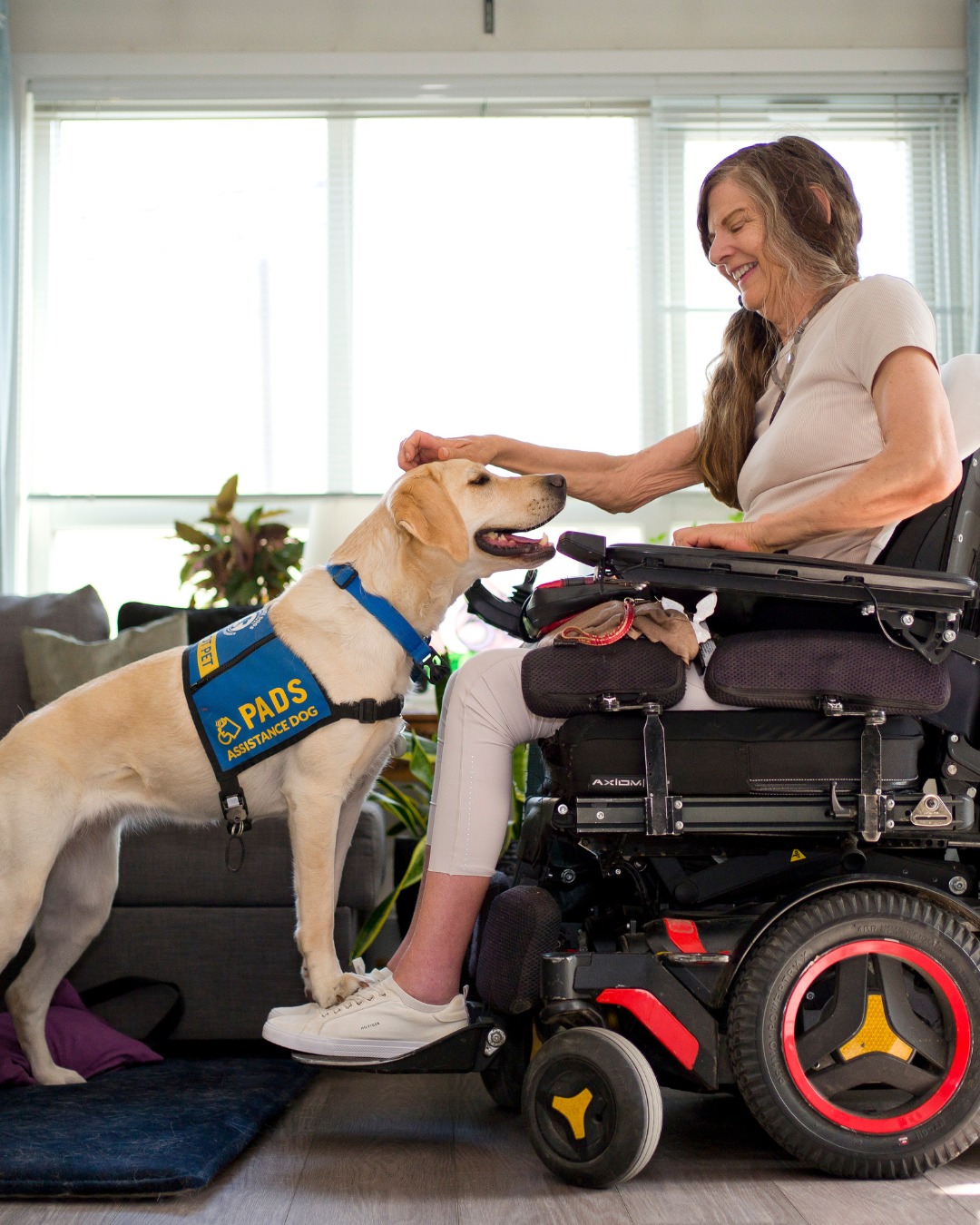 Our Service Dogs are trained to do tasks such as: open and close doors, turn lights on and off, retrieve a telephone or other objects, pick up dropped objects (like a bank card or keys), pull manual wheelchairs, carry items like groceries, retrieve medication and provide balance and stability to clients with mobility issues.
