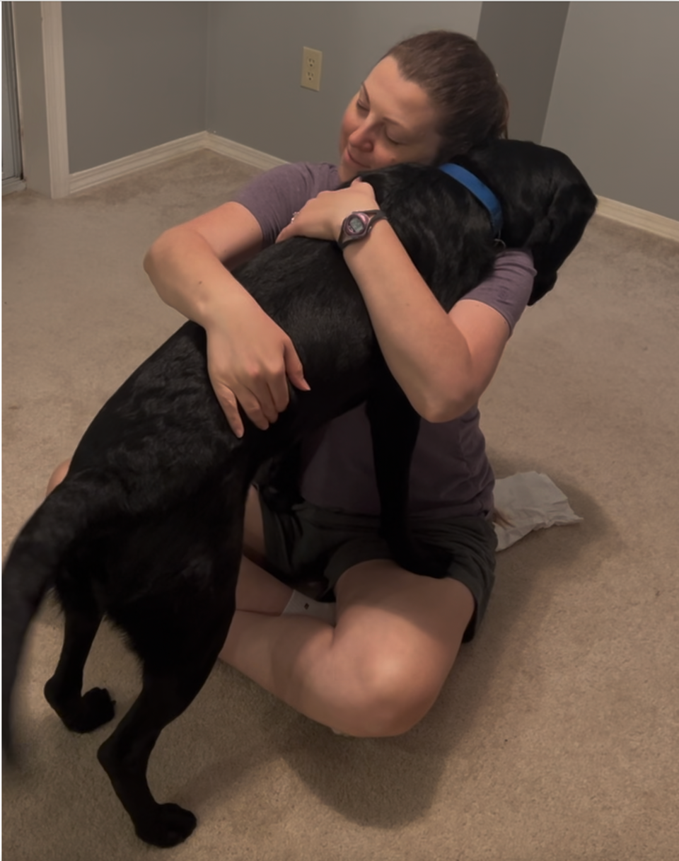 I love learning so much that I invented my own cue. We call it “Hug!” My raiser tends to sit on the floor cross-legged to think and ground herself when stressed. I came over and put my front paws on her legs and leaned over her shoulder, and she instinctively hugged me back. After offering this behaviour a few times, my raisers took the hint, they call it, “Hug!”