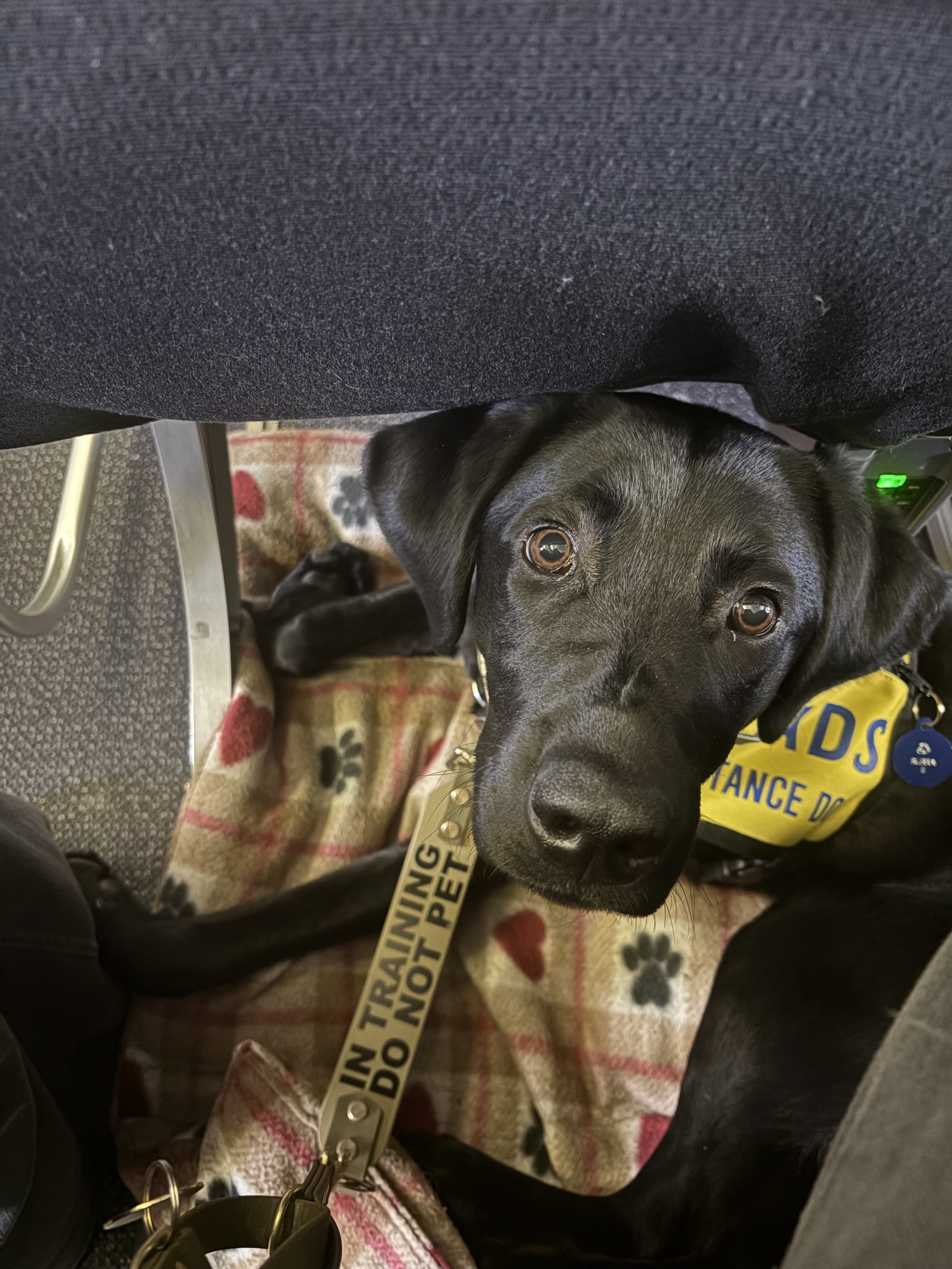 I got to meet lots of new people, practice settling around my raiser’s family dog, Dash (which I got really good at eventually!) and have some fun in the snow. We ended up at the airport 3 times, once flying to Toronto, once when we thought we were flying to Vancouver, only to have to reschedule the flight, and once to actually fly back to Vancouver. I handled each one like a champ and made the human so proud!!