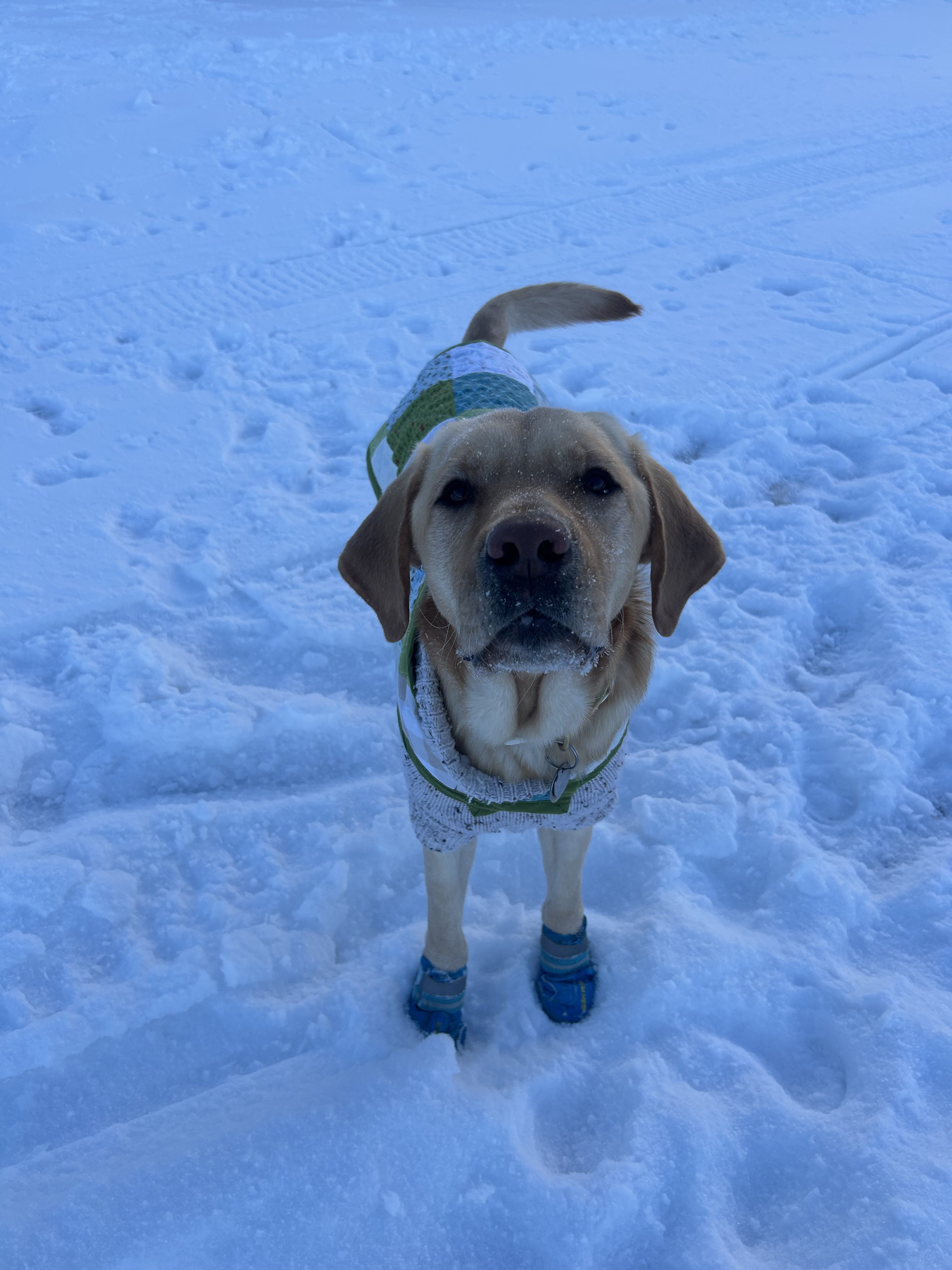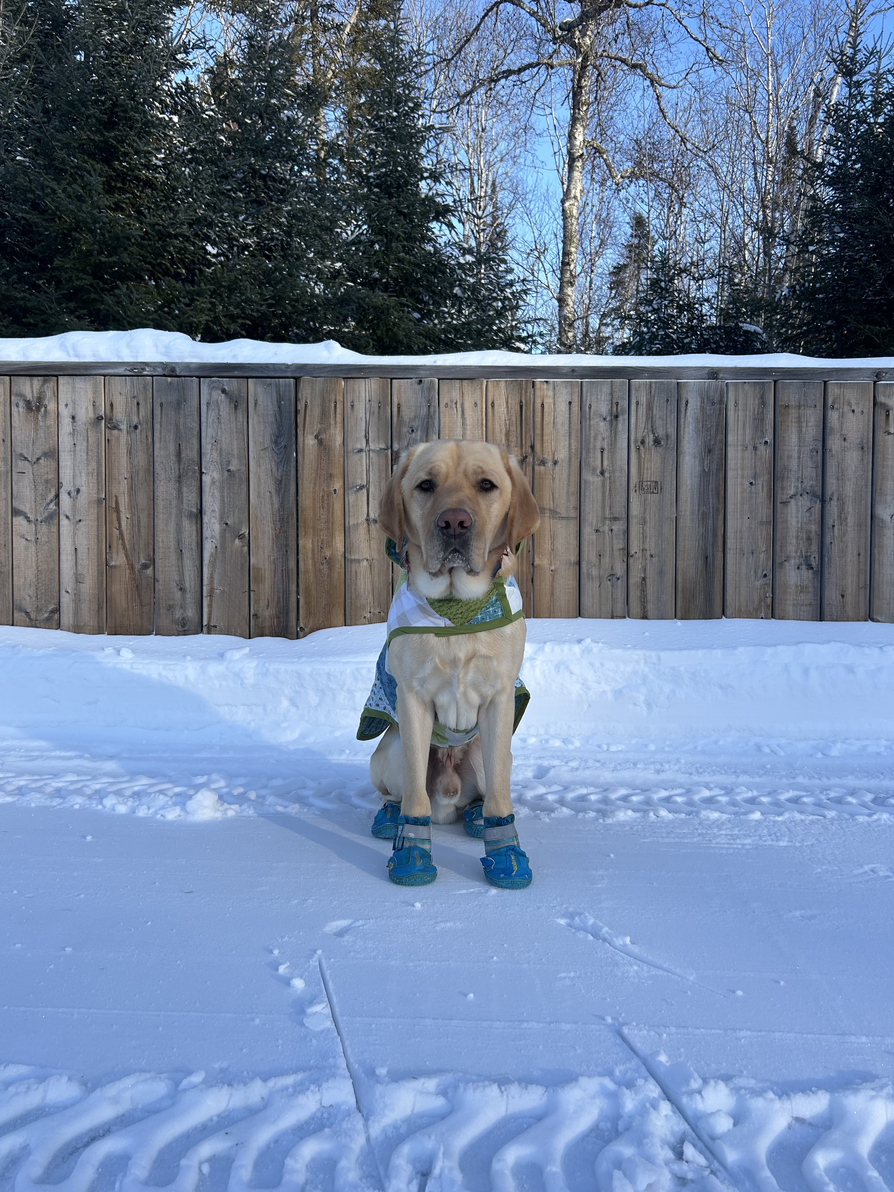 I then went on another flight! My human and I are spending the holidays with her family, which has been super fun. I get to live with my poodle friend Koda! It didn’t take us long to be besties again. We love to play together and snuggle on his big bed. It’s a lot colder here than in Vancouver, so Koda and I have to bundle up to go on our walks. Luckily, my human has knit me an extensive winter wardrobe and packed my booties, so I don’t mind the cold. I’ve also enjoyed going skating with the people. I love to pick up snowballs and retrieve pucks for the hockey players.