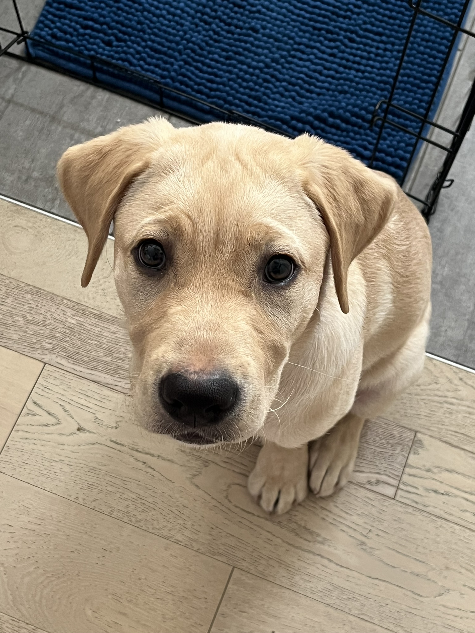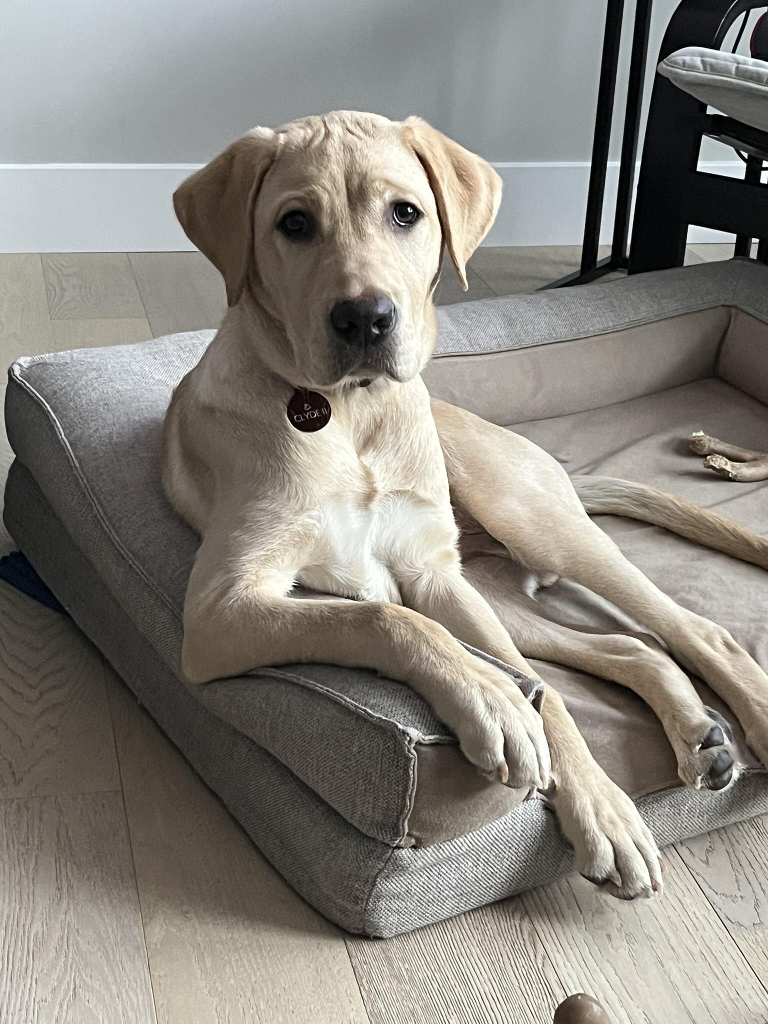 Mr. Clyde II is now 4 months old and has already been on many adventures. From Rona to Costco, pet stores to grocery stores, to observing the other four-legged friends at the dog park from the comfort of our van, you can say that the kid is not fazed by anything. His tail is wagging all the time, and he can’t wait to go to class every week. He’s a confident, curious, and very smart little guy who LOVES training and playing games. He figures things out faster than a speeding bullet, loves to carry things in his mouth, has lots of energy, and settles quite nicely on his bed, where he goes on his own or when asked to.