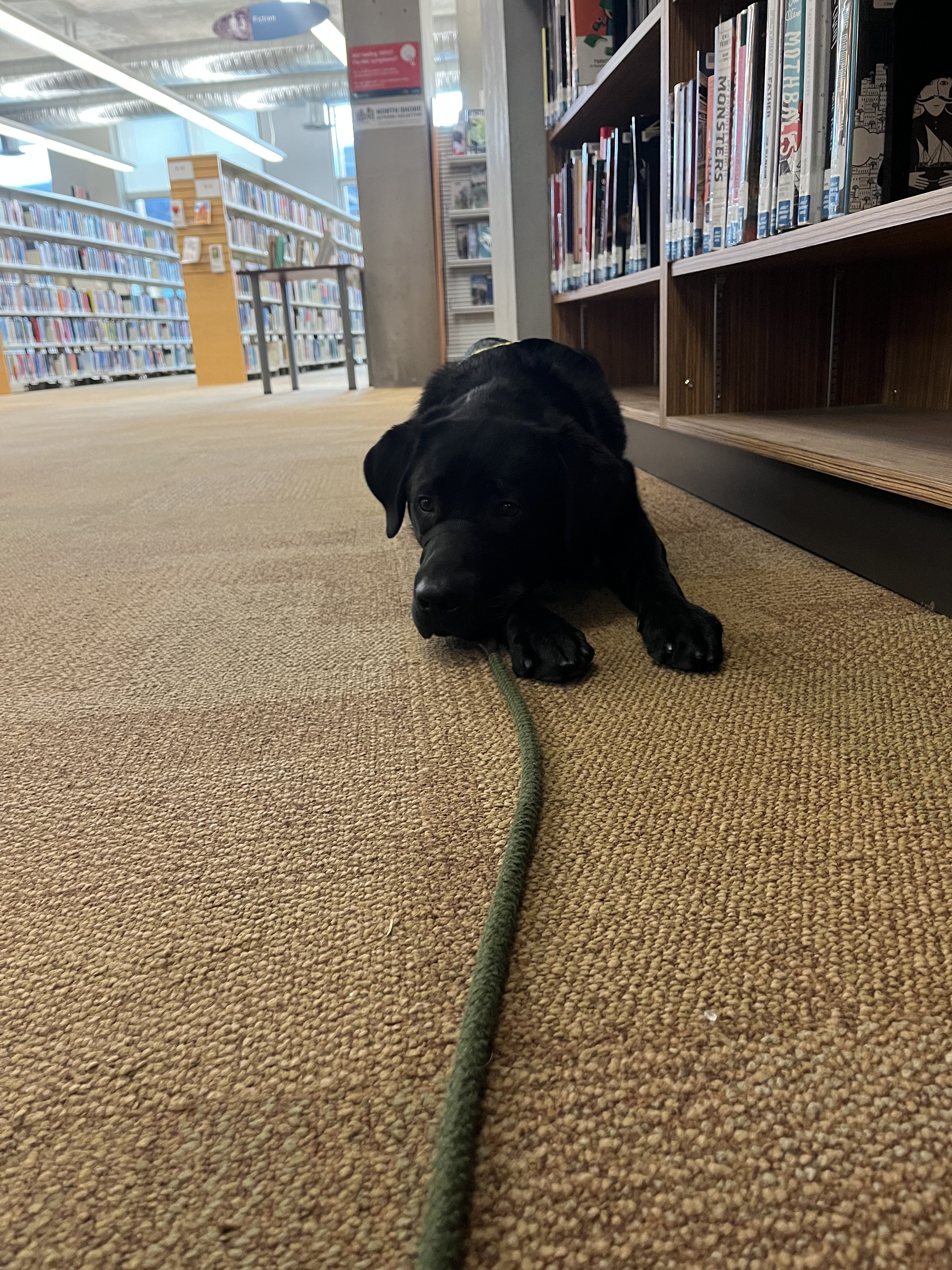 Hello everyone! I’m back from my puppy swap, with lots of tales to tell. I spent a few weeks living in PADS Windsor’s house and going to work with his raiser. You must now call me Mr. Donner because I became an elementary school teacher! This work experience was great for me to practice important skills, like staying calm and not chasing balls at recess. Some days, I wasn’t able to go to school because the field trips weren’t Donner-friendly, so I got to go to a sitter’s house to train. One day, my new friend PADS Major was there too, so we got to have a photoshoot.