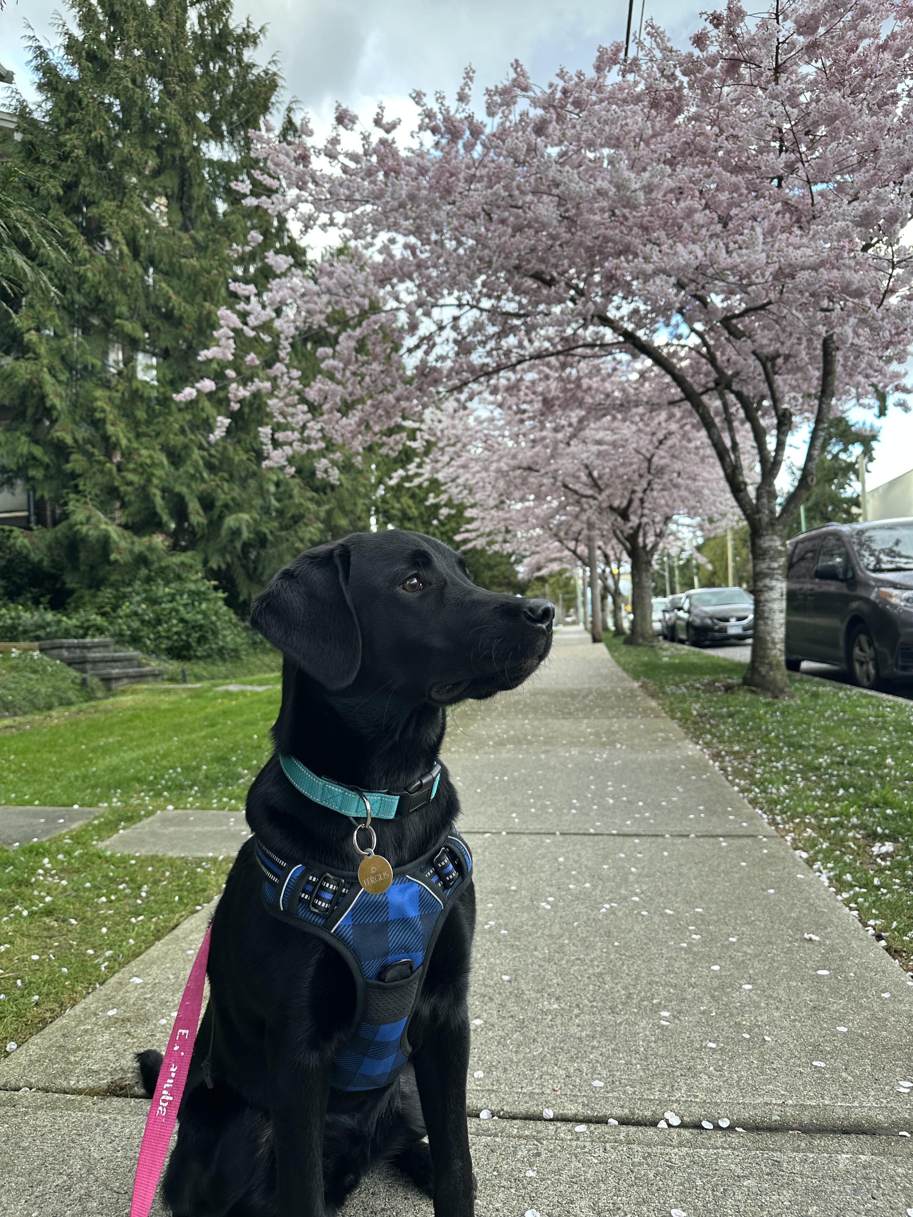 Fergus II | March 2026 Wednesday, April 1, 2026 | Lower Mainland, Pupdates Look at this handsome boy just enjoying the sun, the breeze and the cherry blossoms! Submitted by: G