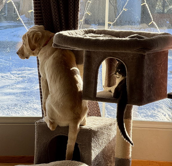 Most mornings, you can find Frosty and the cat at the living room window, checking out the neighbourhood action. But she’s not just spending time with friends and playing in the mud, Frosty has been working on skills like settling, movement and control, heels and sides, and her default ‘leave it’, which she sometimes forgets about.
