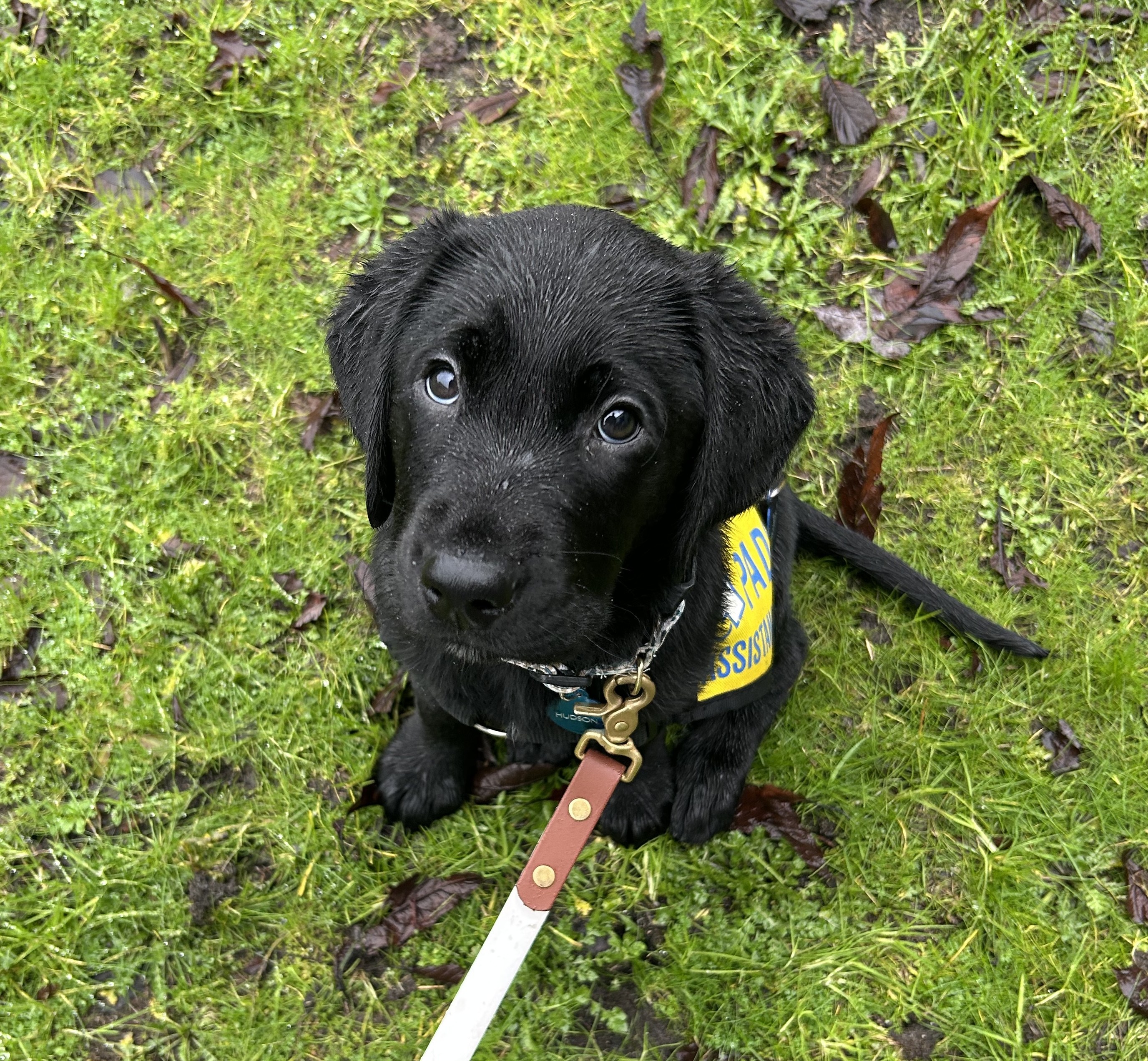 My name is Hudson, and this month I started my journey as a PADS dog! For the first three weeks of January, I was still hanging out with my 4 siblings and my mama, NSD Turbo, at National Service Dogs in Ontario. Once I turned 8 weeks old, I was ready to say goodbye to my littermates and go out on my own. And that’s when I went on a big adventure on an airplane and flew all the way to Vancouver! There, I was given my first-ever yellow PADS vest! I met my puppy sitter (I’m told I don’t have a permanent raiser yet), and started settling in with her.