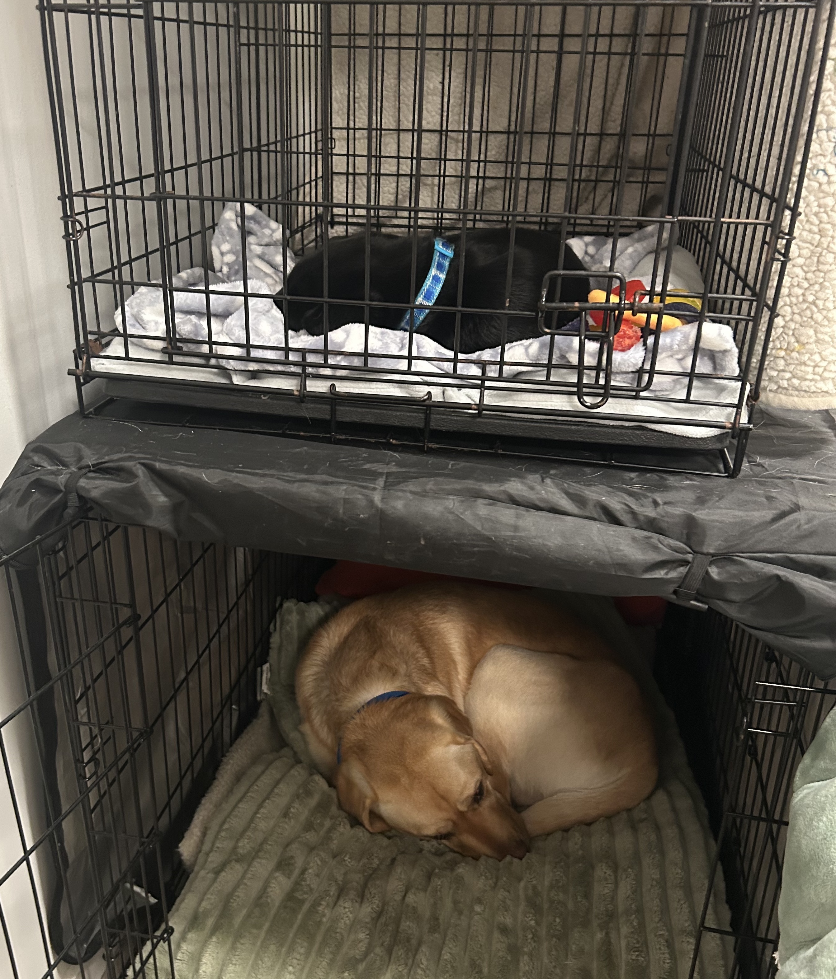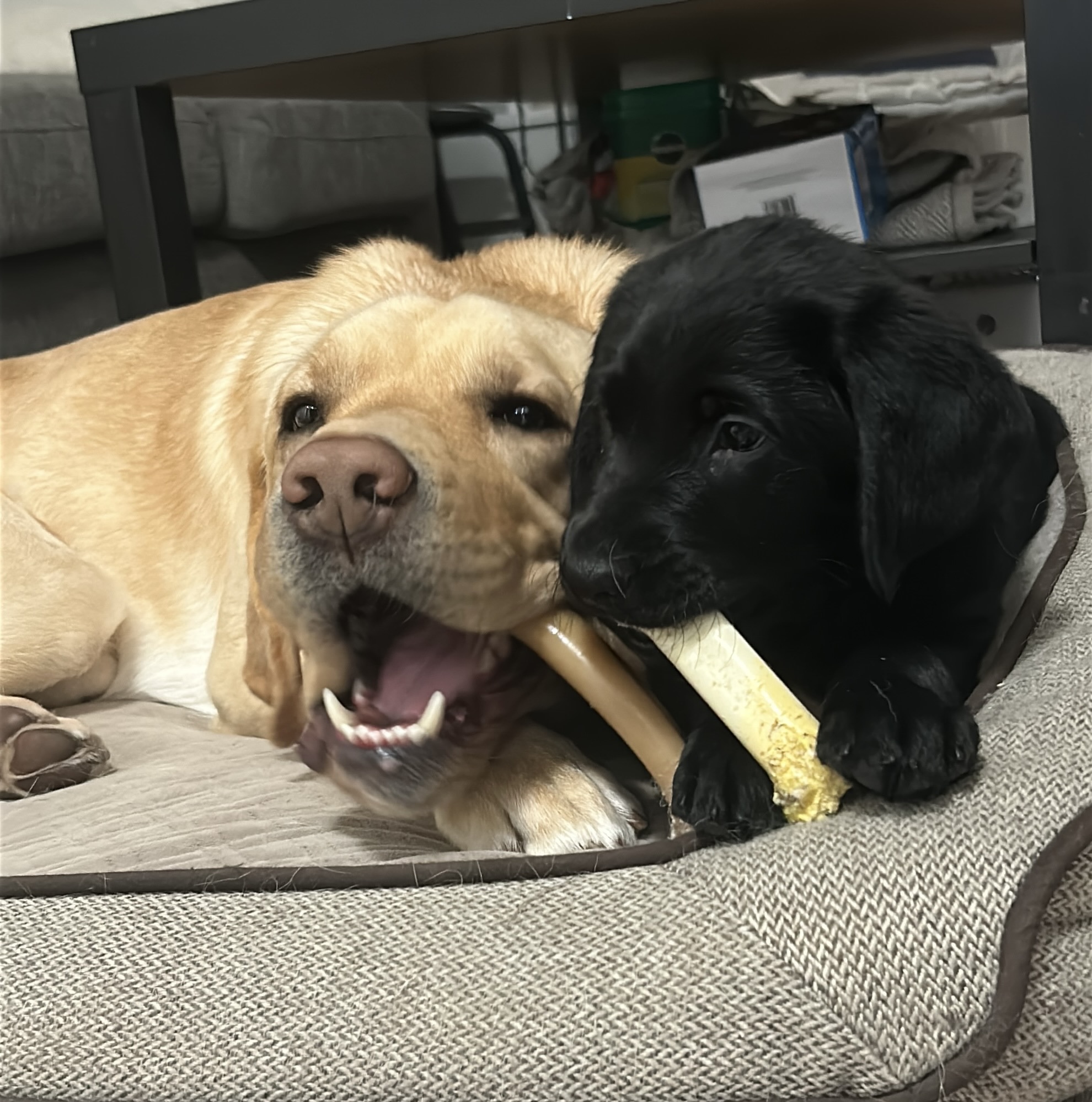 At my sitter’s house, I got to meet my dad, PADS Casper! I get to hang out with him for a little while, which is so much fun. I was a little intimidated by how big and excited he was at first, but since then, I have become very brave and absolutely love to play with him! He has taught me the important lessons of how to play bitey-face, chew bones, and play tug (though he always seems to win that one). He also keeps me company at night as we sleep in our bunk bed kennels!
