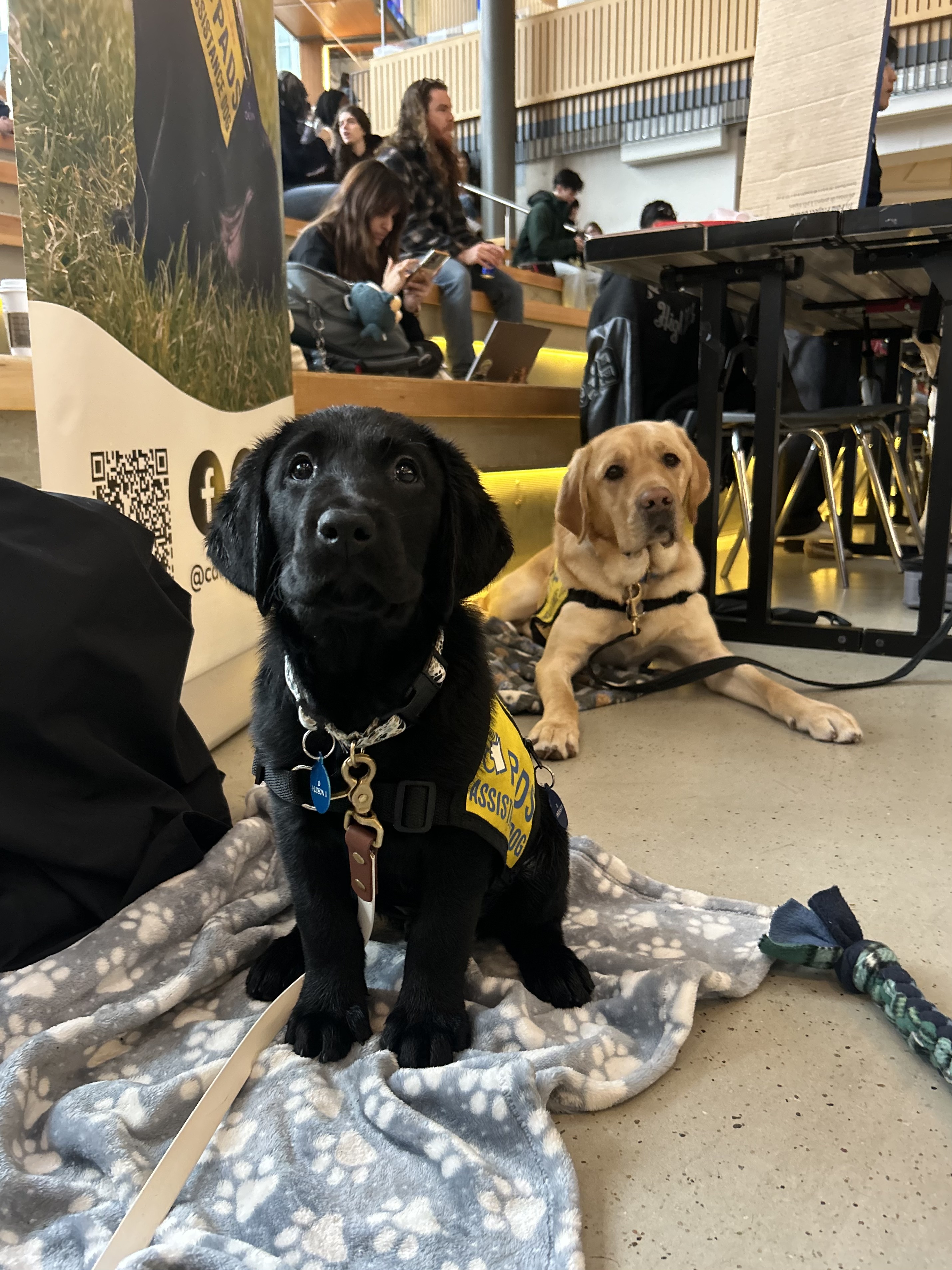 On top of school, I have been on a few fun outings! I went to puppy class at UBC, where I started learning lots of new skills! I saw lots of puppy friends and did a great job ignoring them. I also went to a toy-making event with the UBC Campus Canines, where I took a nap, got a new chew toy, and said hi to a few people! My last outing of the month was attending a club fair with my dad. I was a very well-behaved boy even among the crowds and all sorts of noises. I just took a nap on my blanket and watched the world around me.