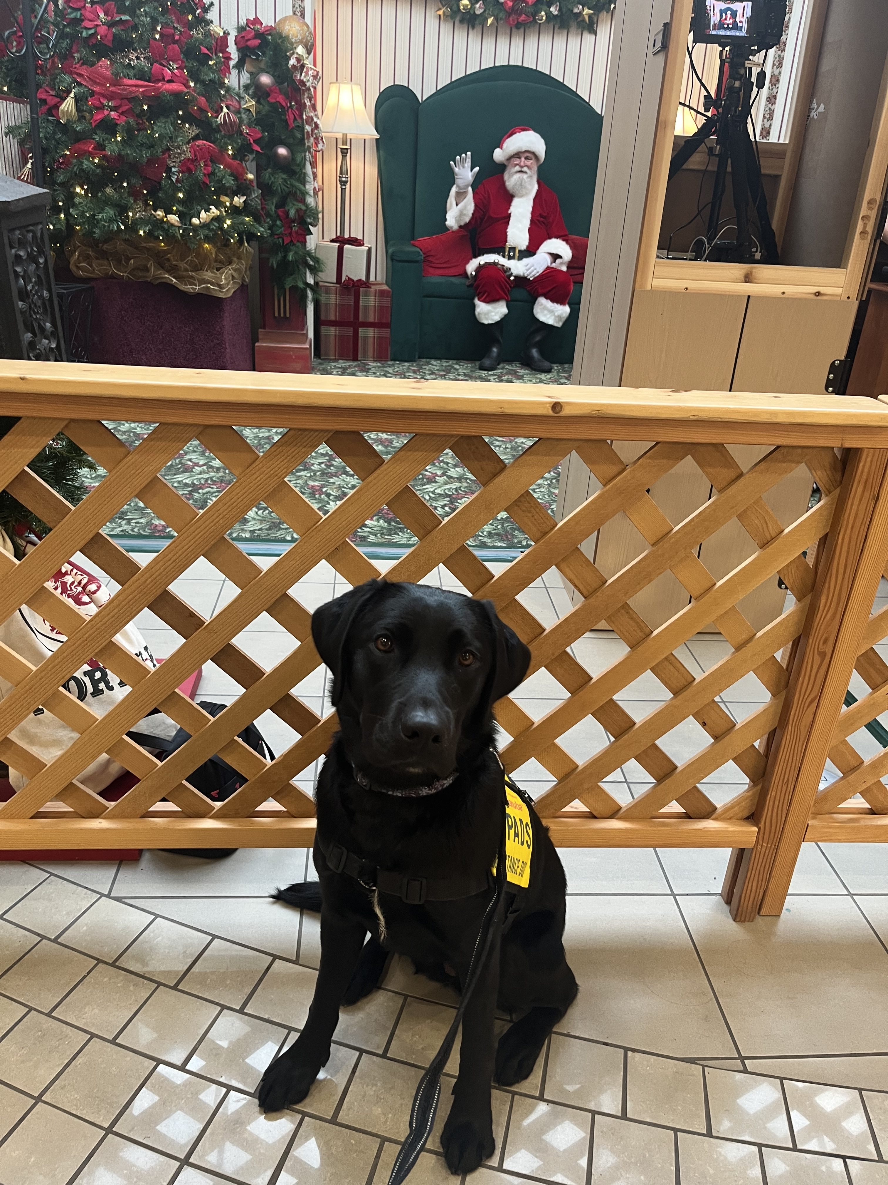 After Libby’s return from her puppy swap mid-month, December continued to be a month full of social events and bright lights. Libby attended several Christmas parties and visited Santa at a mall. She also received a lovely Christmas gift from one of her PADS sitters—thank you, Jeff!