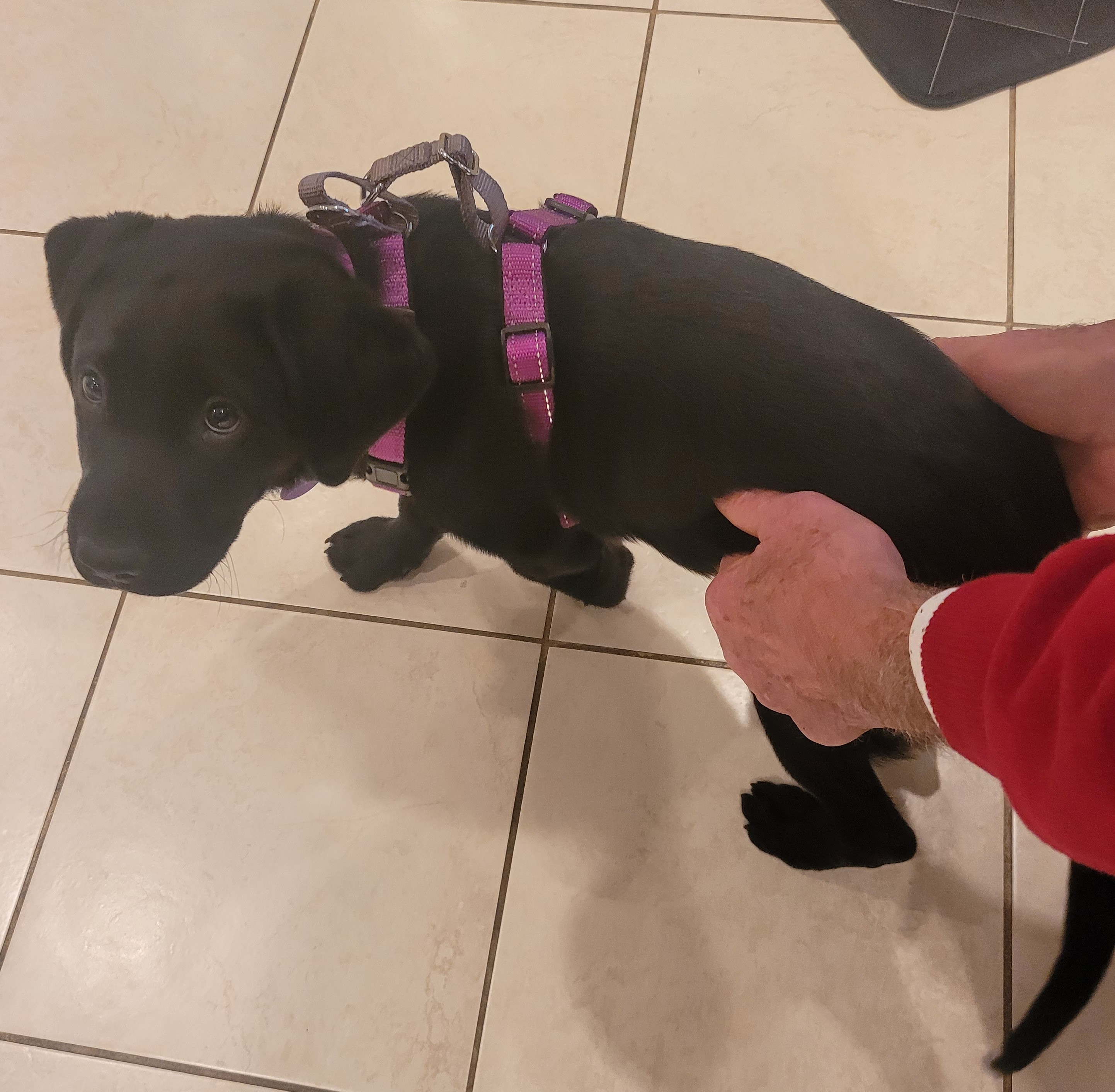 My journey to the Okanagan was fun, and I got to ride with PADS Milos and his people. I was excited to meet my own new people, and they loved me right from the start. They put me in a pretty t-shirt that said Princess. They think I am such a good girl cause I sleep right through (even the first night) and do not chew everything I see. I have not told them that might change, as I am pretty spicy when I get comfy.