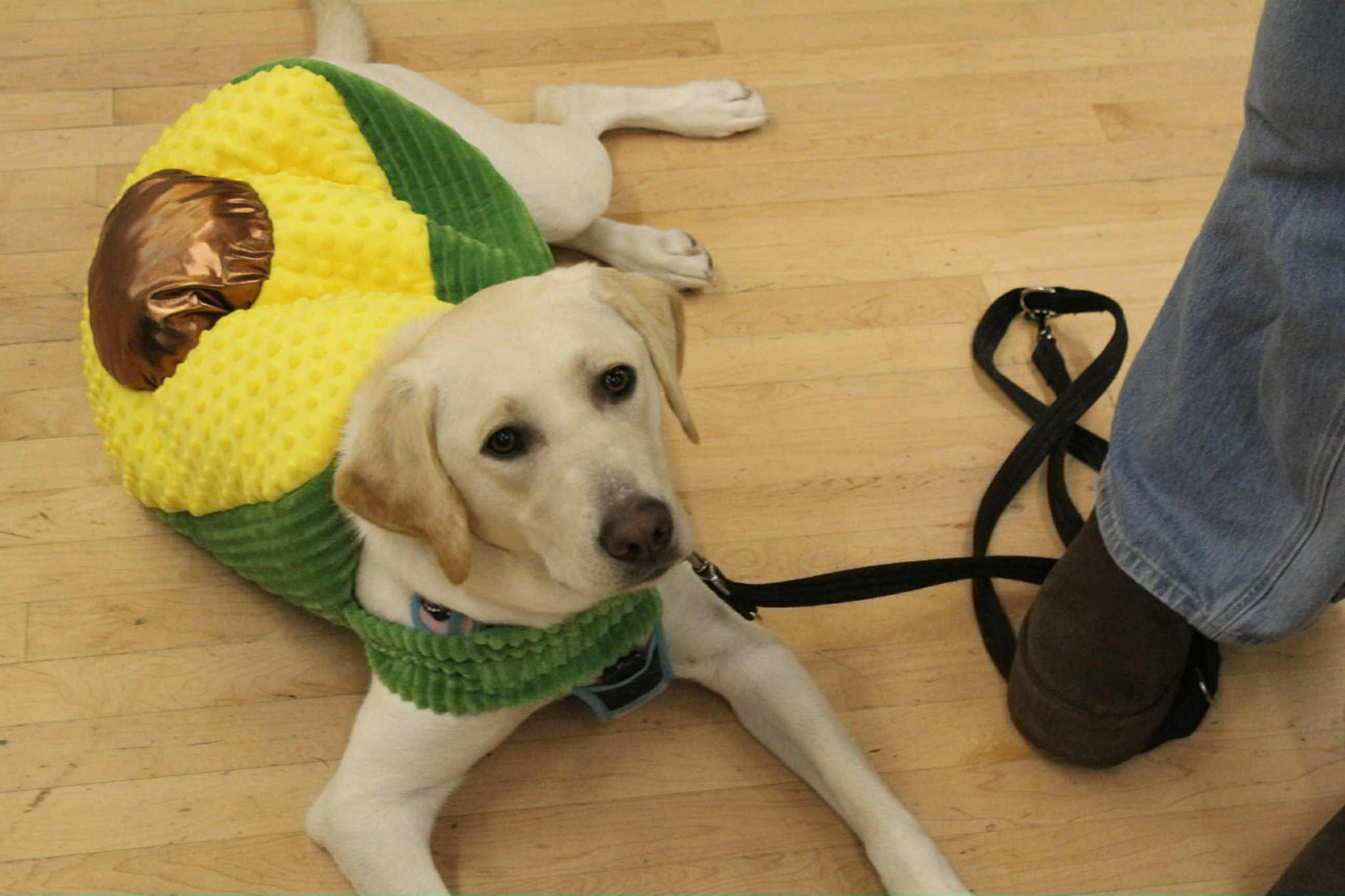 I’m very good at my routine at university now – walk, sleep, walk, play, sleep, then bus home. The weather is getting colder, but I’ve still gotten to enjoy a few off-leash walks in the forest this month. I’ve been working hard on loose-leash walking, settling, and “go say hi” with humans. I think I’m getting pretty good! I ended the month with my raiser putting a funny costume on me, but I didn’t really mind it.