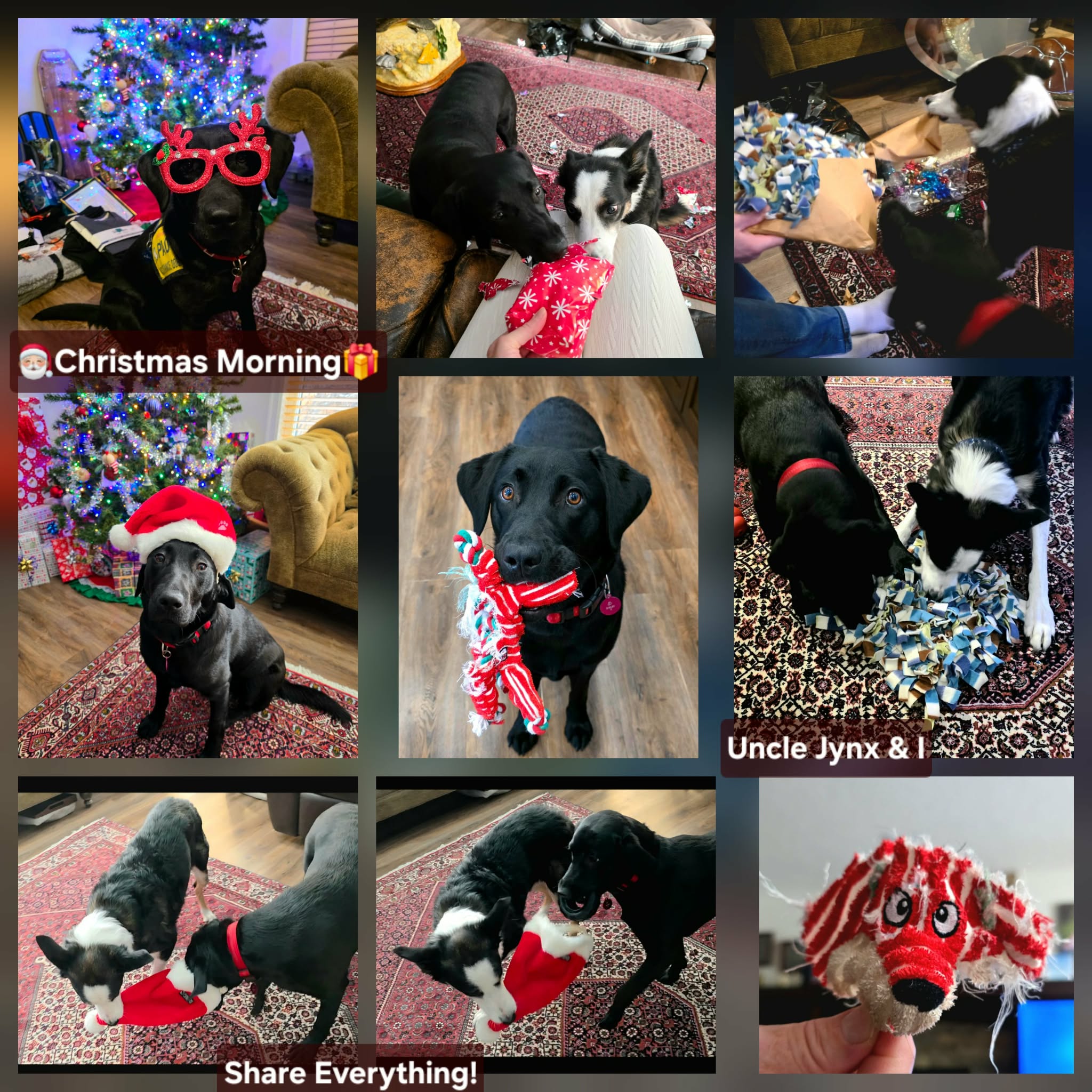 Christmas morning was full of excitement. Uncle Jynx and I had the chance to unwrap many presents, which made us feel like very lucky pups. My two favourite gifts were a snuffle mat and a little Foxy, generously given by Bonnie and Uncle Jynx. My favourite holiday treat was whipped cream on a peanut butter puppy cookie, which felt like a very special reward.