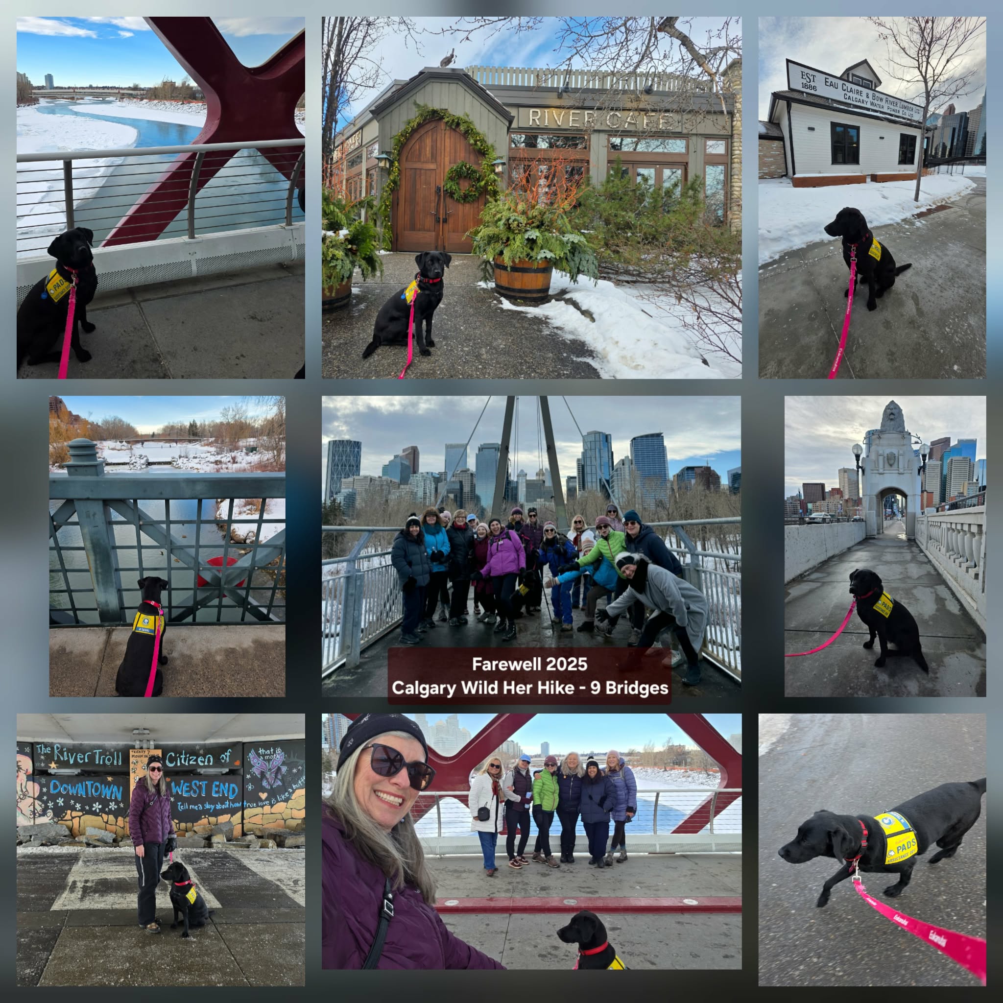 One of my biggest training milestones this month, outside of medical facilities, was joining the Wild Her Ways hiking group of 17 awesome ladies to walk across nine (9) downtown Calgary bridges. This was my first time working “in cape” with a large group of people, practicing my heeling on a four-foot, flat leash, waiting for permission to “go sniff” periodically, relieving myself on cue in appropriate areas, and staying focused despite the many distractions and smells. It was a Huge test for me, and Diane, the organizer, said I did a great job, invited us to go for coffee afterward, and said we are welcome to come back again. How cool is that!!