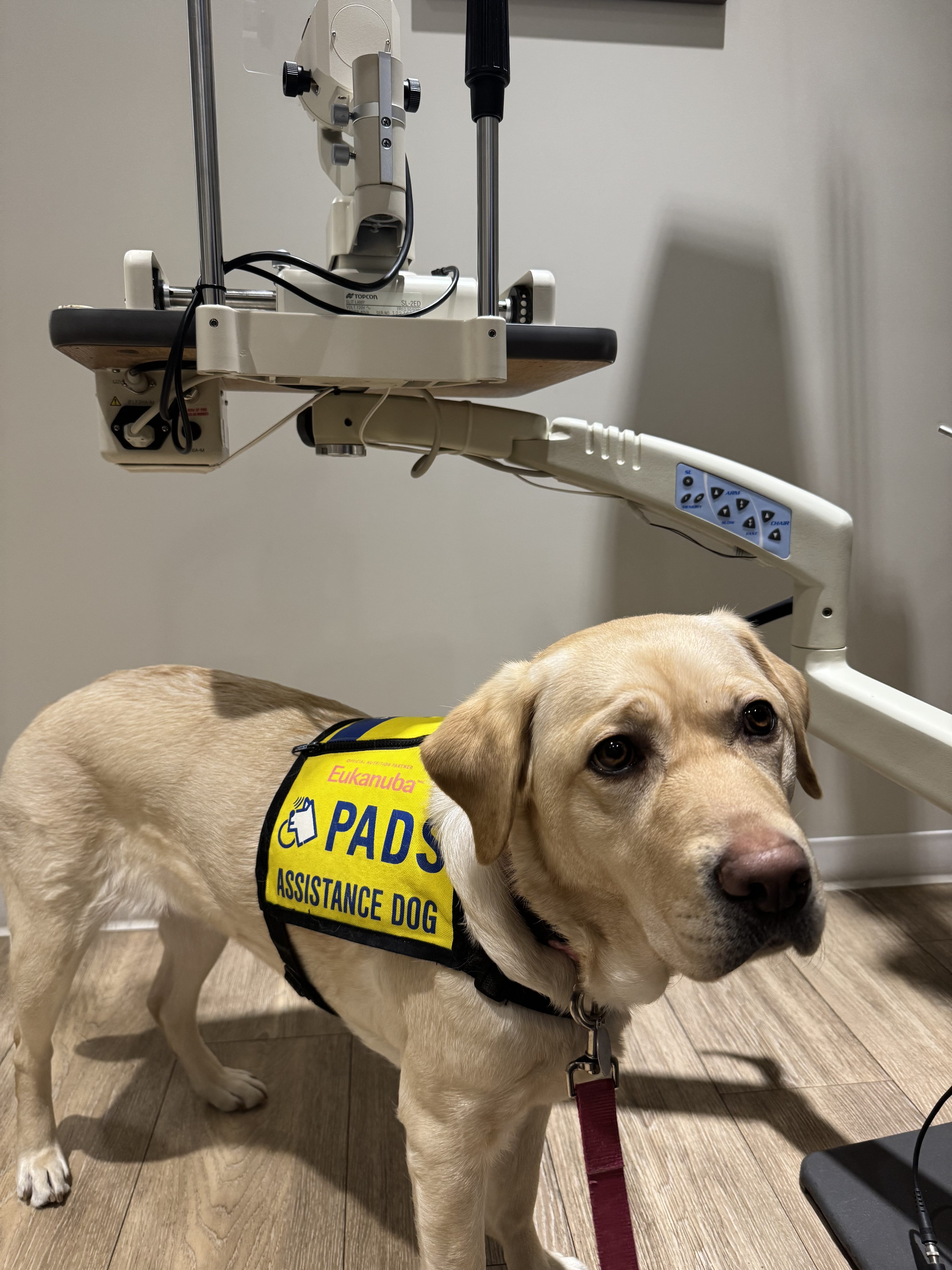 I also had a couple of new outings this month, including trips to the optometrist’s office while one of my raisers had their eyes checked and got fitted for new spectacles. I behaved like the professional service dog in training that I am, calmly observing the strange machines while keeping a close “eye” on my human.