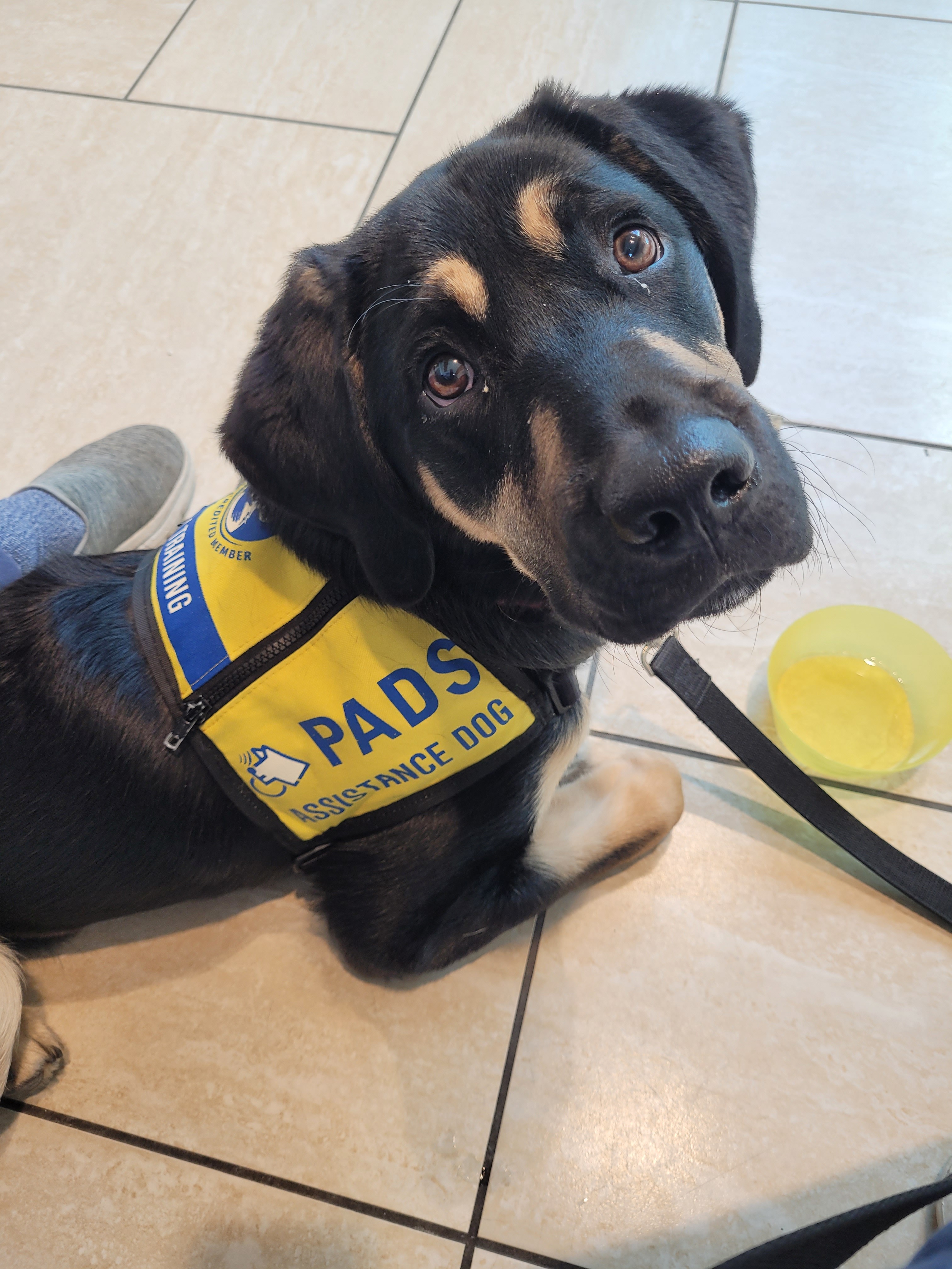 Some of the places I visited this month included the mall, grocery store, bank, hardware store, and hospital. Each location gave me valuable practice navigating different environments and distractions. I’ve also discovered that I’m especially interested in children — they’re lively and full of energy, and when I see them, my tail tends to wag just a little bit more. I’m learning to notice them calmly and keep my focus while staying polite.
