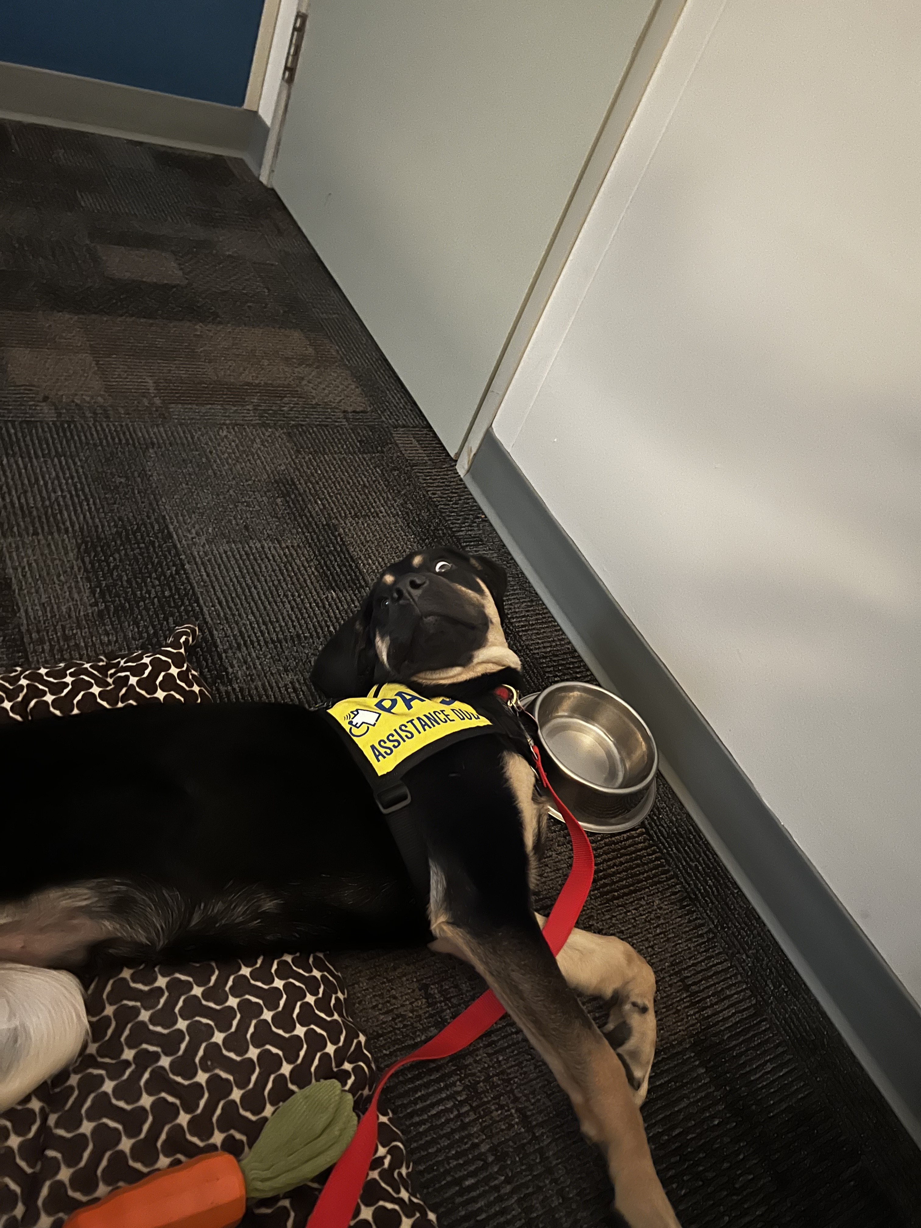 In the second half of the month, my other raiser returned home, and I transitioned back into my familiar routine. After breakfast and some playtime in the mornings, I headed out to practice my public access skills. These outings included trips to the mall and running errands, where I focused on walking nicely, settling calmly, and observing my surroundings. I even overheard a few people comment on how well I was doing, which earned some quiet moments of proud puppy focus.