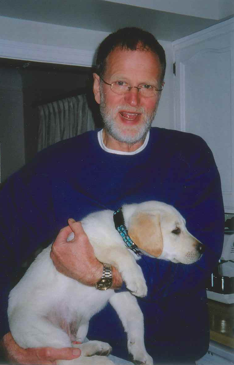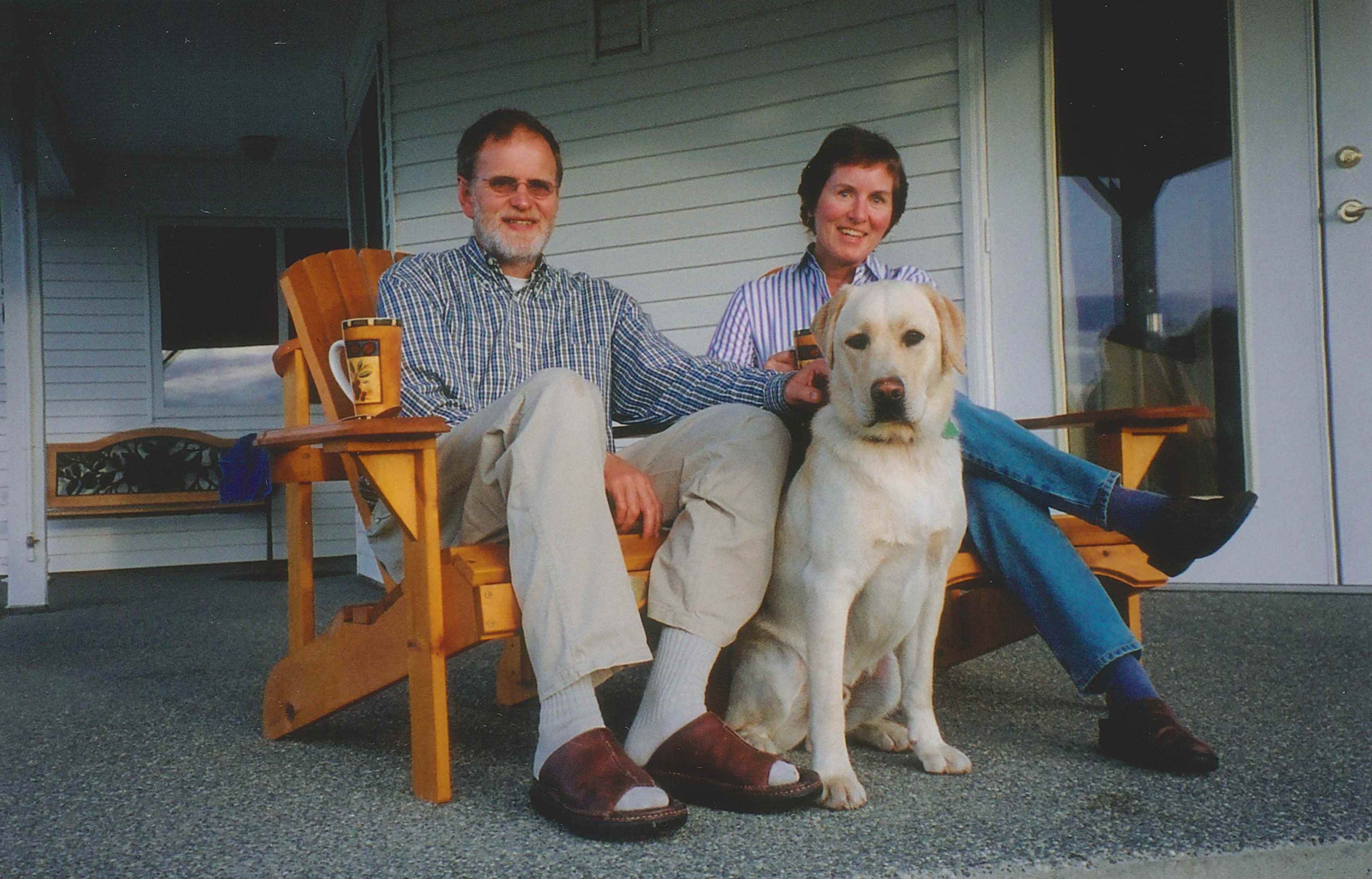 For Jonathan and Susan, it began with Bear. It was 1995, and Jonathan had encountered a yellow-vested PADS dog at the PNE. He was familiar with service dogs in the UK and was curious enough, that he called PADS. The person who answered that call was very helpful and offered to “drop by”. Shortly thereafter, Ron Tymrick arrived at Jonathan and Susan’s home in East Vancouver. After a lovely chat, he asked if they wanted to meet one of the PADS dogs. When they said yes, Ron went to his van and brought out Bear, a seven-month-old, 70-lb Shepherd-Lab cross from the BC SPCA.